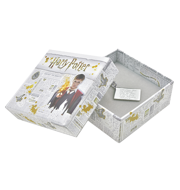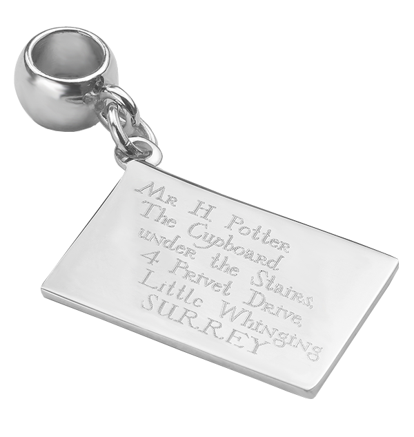 This Personalized Hogwarts Acceptance Letter Charm features an engraved stainless-steel charm along with your chosen name alongside the iconic Privet Drive address, presented in a Harry Potter gift box.