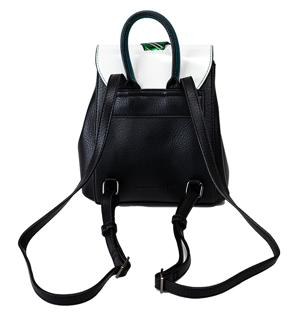 The backpack goes on to feature complimentary silver hardware in a magnetic snap closure for the main flap as well as on the sides to allow for expansion. The deluxe lined interior features two compartments, one in the front and the other with a zip closure in back. Adjustable shoulder straps allow for a secure and comfortable fit for any aspiring Slytherin student!
