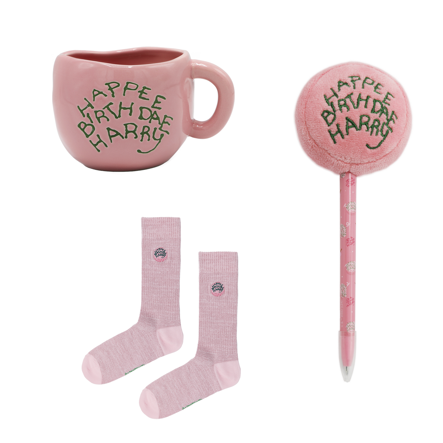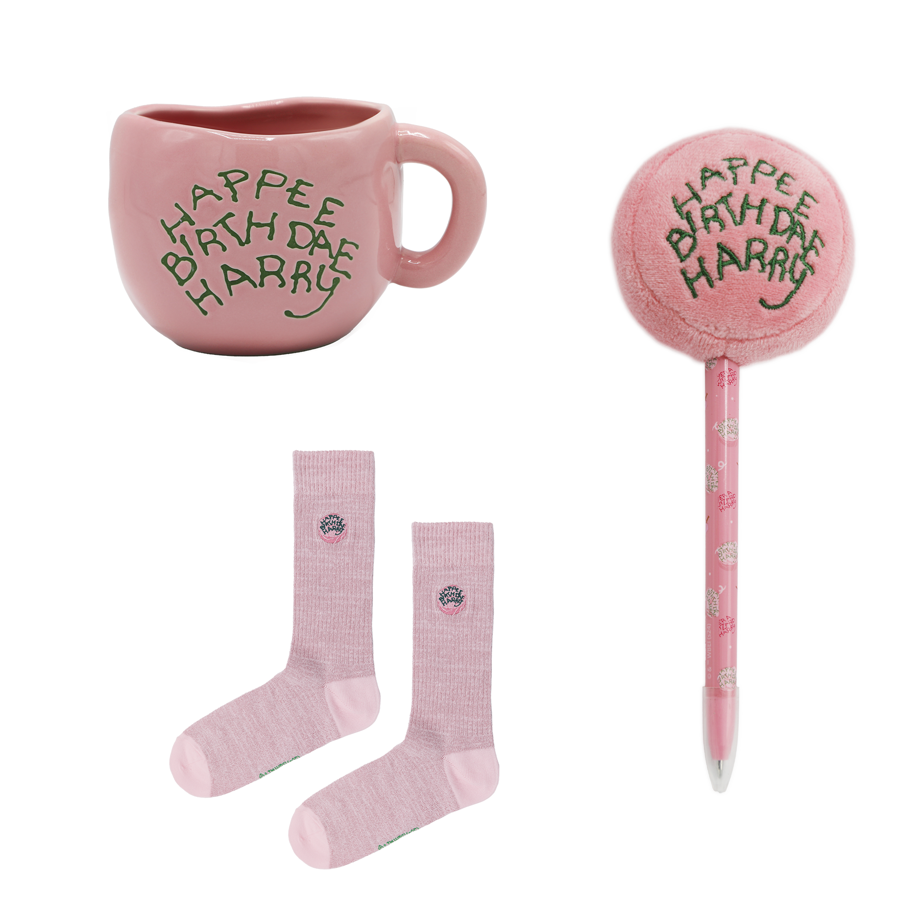Inspired by the unforgettable moment Hagrid surprises Harry with his first birthday cake in Harry Potter and the Philosopher’s Stone, this exclusive Happee Birthdae Harry Gift Set includes three unique items from the Happee Birthdae collection: a handcrafted-style ceramic mug, a plush cake-topped pen, and a cozy pair of pink cake-embroidered socks.