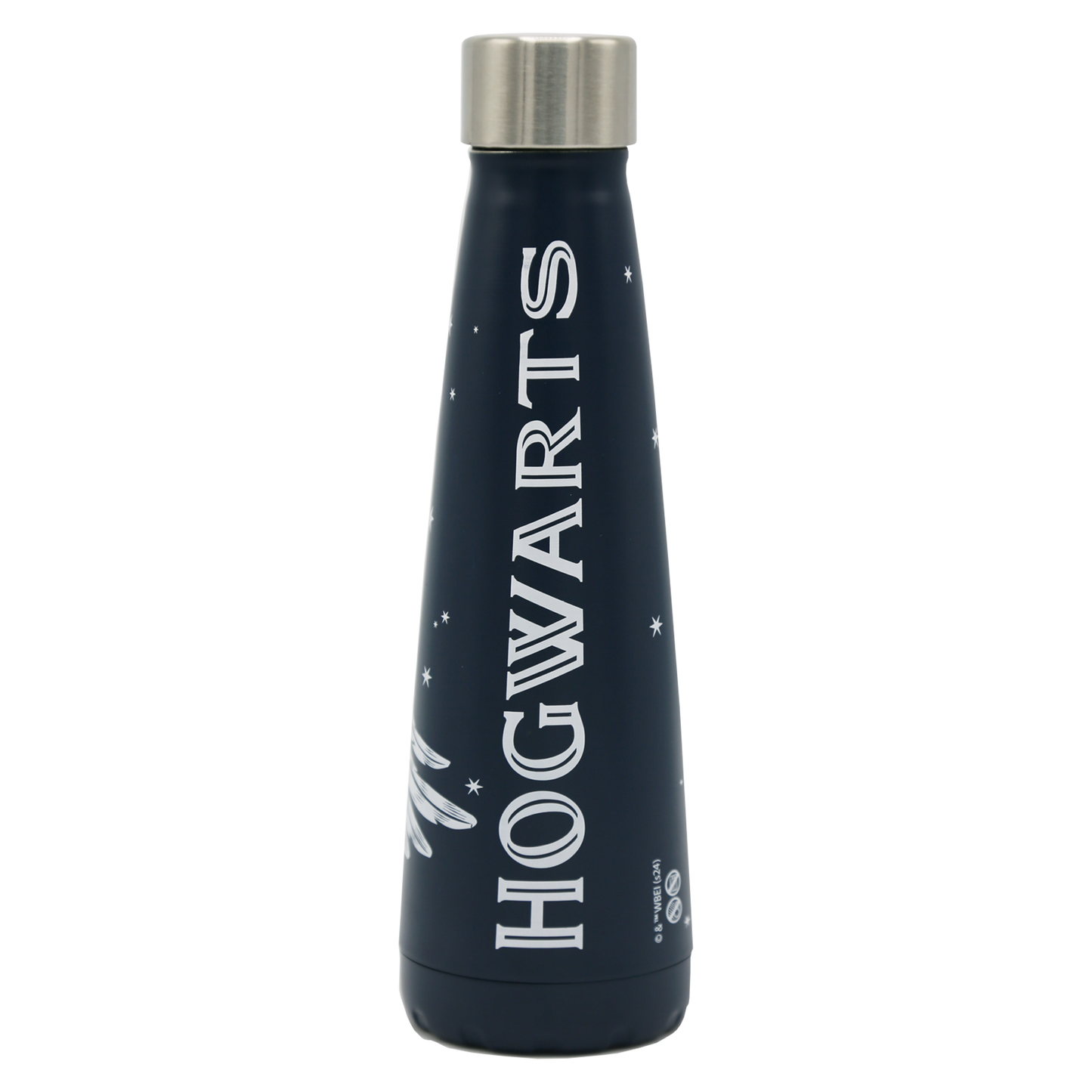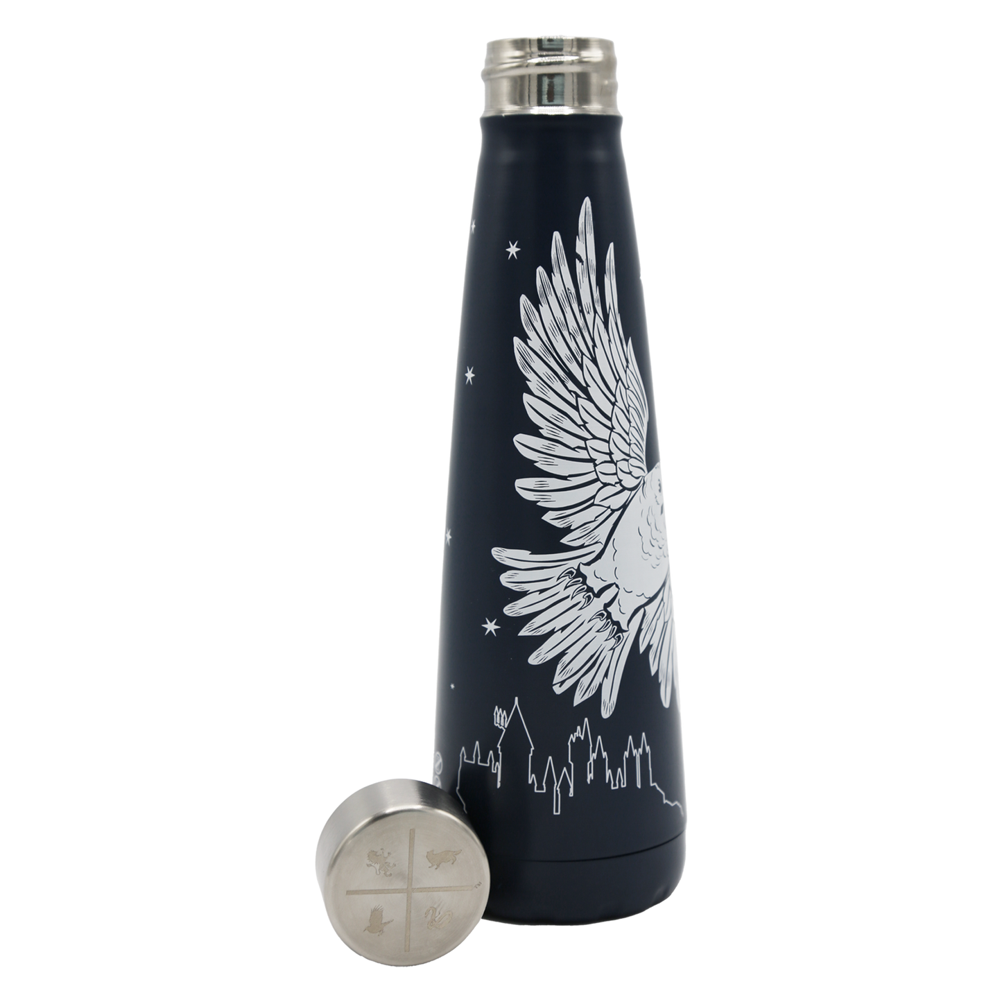 Stay hydrated with this Magical Hogwarts Water Bottle, crafted from high-quality stainless steel. The bottle features a design exclusive to the Magical Hogwarts collection with Harry Potter's faithful snowy owl Hedwig soaring through a starry night sky. The silhouette of Hogwarts Castle can be seen in the distance, with the name of the iconic wizarding school "Hogwarts" boldly displayed along the side.